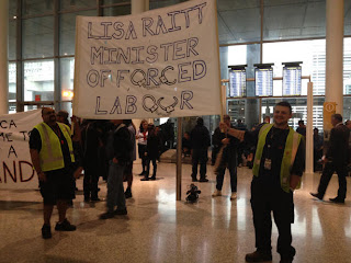 Air Canada suspended the three workers as Raitt called them “animals” in the process. Shortly thereafter, Air Canada around 150 ground crew began a wildcat strike and took to marching through Terminal 1 (domestic) chanting “Fire Lisa Raitt” and demanding the suspensions be lifted. By Friday morning, dozens of workers at Pearson and across Toronto joined the protest which had grown to over three hundred. More recent videos show a CUPE 966 Flying Squad bus at Terminal 1 and support from CAW workers as well.