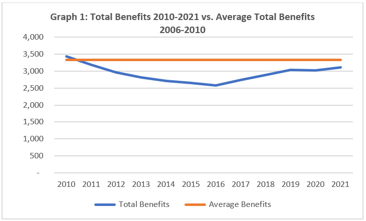 The average annual benefits paid out to injured workers from 2006 to 2010 was approximately $3.333 billion. When the average annual benefits paid out from those years is projected on each year from 2011 to 2021 and compared to the actual benefits paid out to injured workers each of those years, it reveals that injured workers were under-compensated in this decade by about $4.945 billion.