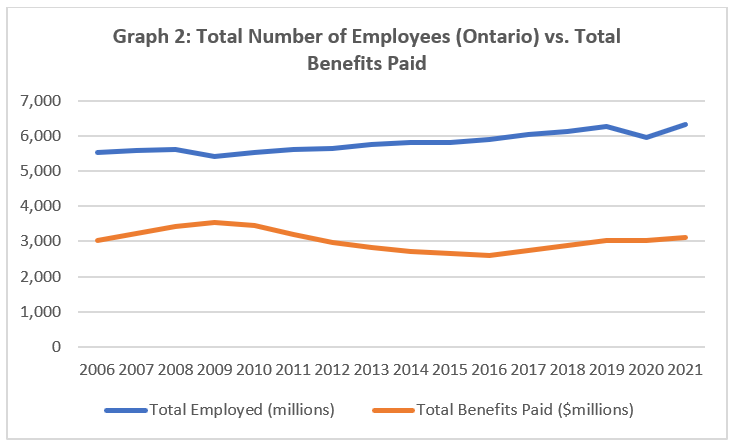 Perhaps variations in the employment rate to explain these changes: fewer people employed could account for fewer claims. However, employment data from Statistics Canada shows the total number of employees in Ontario grew steadily except during 2009 (Great Recession) and 2020 (COVID). In fact, the amount of money for benefits paid peaked as the employment rate dipped after the Great Recession in 2009.