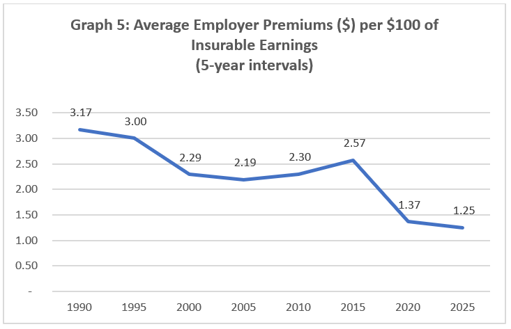 Unlike the Harris years, average premium rates per $100 of insurable earnings increased. From 2006 ($2.26) to the 2016 peak ($2.59), average premium rates increased about 1.3% per year. Notably, those increases were below the rate of inflation for most years. And when premium rates peaked in 2016, they were still far below the rate from virtually all of the 1990s.